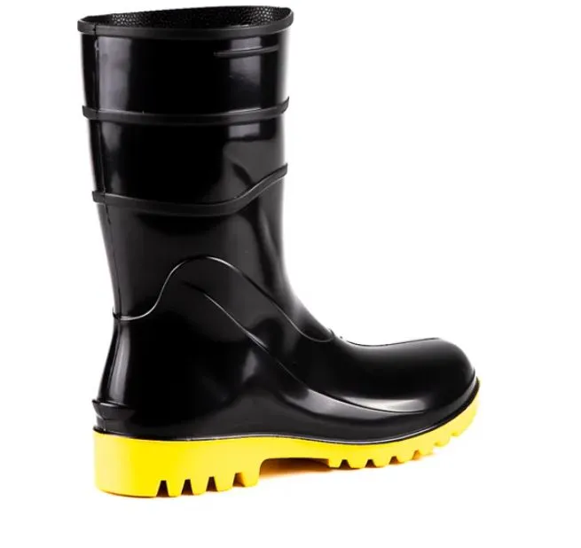 Solado amarelo antiderrapante e cano médio em PVC resistente, oferecendo estabilidade e proteção contra líquidos.